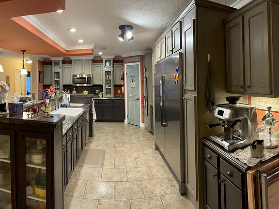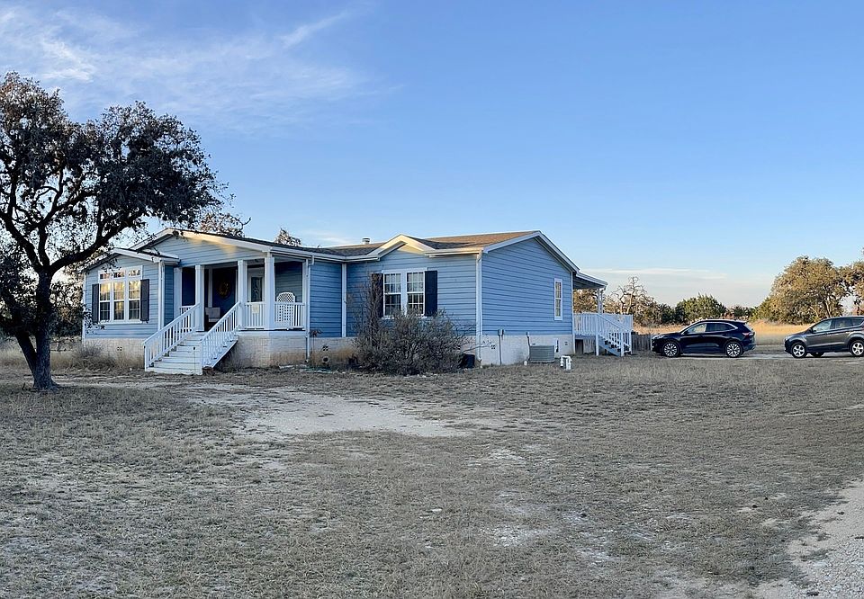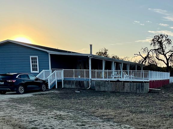 All the privacy of living in the country in a lovely setting. 3/2 triple wide mobile built in 2011. This home is so welcoming from the front entrance leading into the main living room, flowing into the dining room. The coffered ceiling and unique chandelier set the dining area apart. The kitchen opens into the media/family room with a wood burning fireplace, large windows looking over the pool and field. The kitchen has custom cabinetry in a country style, with an amazing side by side refrigerator/freezer. There is a small walk in pantry in the kitchen. The sink has custom copper backsplash, solid designer countertops, and a deep country sink. There is a breakfast bar on the other side of the island that can also be a home computer station. The bedrooms are split with two comfortable sized bedrooms on the North side of the house. These are served by a full bath. On the other side of the family room is the laundry room with storage closet, outside entrance to the back deck. The primary bedroom is spacious with plenty of room for King size bed, settee. The walk in closet has built in shelves, shoe storage, and dressing bench. The ensuite bathroom has a separate walk in shower and garden tub. There is a spacious metal workshop with 1/2 bath and finished office. The building has a propane heater to keep warm on cold days. Two large roll up doors make it easy to pull in equipment such as tractors. The property is level with deep native grasses, Oak trees, and some cedar. The back deck and pool is an oasis to itself. Deep covered porch with adds a third living area everyone will enjoy. Perfect place to watch the sunset or stargaze on a clear night. No restrictions or HOA and great school district make this a must see property.