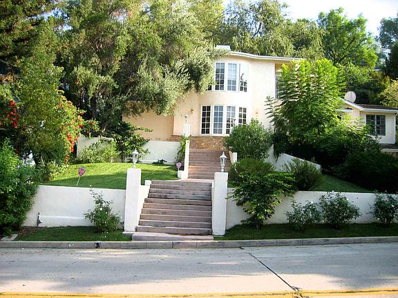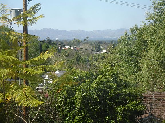 Updated 2-story house on a knoll above the street. 16,400 Sq.ft. lor. Large yards; Flagstone patios. Views of the mountains and tree tops. 2 Jacuzzis; 3 Marble fireplaces. Formal dining room. Den to back yard. Refinished oak floors and recessed lights throughout. 2 master suites. Walk-in closets. 2-zone AC/heater. Subzero refrigerator, granite counters, oak cabinets, new Kohler ceramic sink. Built-in double, self-cleaning gas oven, 5-burner gas cooktop, dishwasher, breakfast nook. One-bedroom guest house with bath. 5 min. to Whole Foods and Ralph's.Gardener included.
