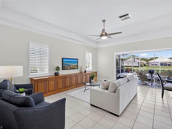 On a quiet cul-de-sac in Glen Eden, this North Naples residence offers lakefront living just minutes from the beaches. A paved driveway and tropical landscaping welcome you to this Bayview model with a spacious open-concept layout. The home features three bedrooms, two baths and a two-car garage. Interior highlights include fresh paint, high ceilings, plantation shutters, French doors and expansive windows that maximize natural light and showcase western exposure sunsets over the lake. The private primary suite offers generous dimensions and serene views. The kitchen and living areas are designed for functionality and flow, ideal for entertaining. Outdoors, the screened lanai includes a pool with spa overlooking the water. Glen Eden is a gated enclave of just 97 homes, offering residents a clubhouse, fitness room, and community pool with spa. This well-maintained community is ideally in North Naples near top dining, shopping and Gulf beaches—an exceptional opportunity to own a slice of paradise.