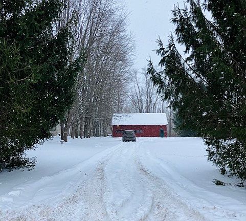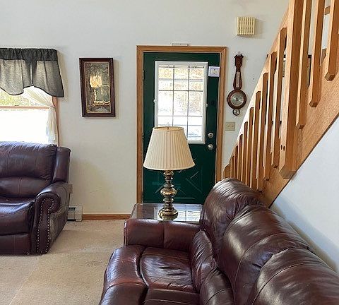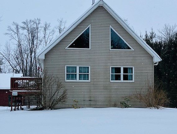 Exclusive Cape Cod home located in private country setting lined with mature evergreen trees. The 3 -bedroom 2 bath home offers a main floor master bedroom with on suite for convenient first floor living. The open concept kitchen with ample dining room that opens to spacious living room that features a Rutland wood stove for economical heating option. Custom built oak kitchen cabinetry with huge island for gatherings open to large dining area. The home boasts expansive large triangular windows that provide plenty of natural lighting. Located on main floor off the kitchen is a laundry room with plenty of storage. The second floor offers two bedrooms with full bath. There is a home office in the loft with custom built in cabinetry and windows that offer views of nature. There are solid wood six panel doors throughout the home. Exceptional immaculate 2 car garage built in 2000 with electric. Garage provides ample room for cars, workshop and storage. Located in the back of the garage is a charming patio with a roof for summer entertaining or relaxing. The full basement has plenty of storage area and can be easily upgraded for additional living space.