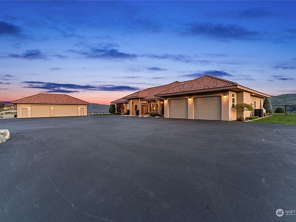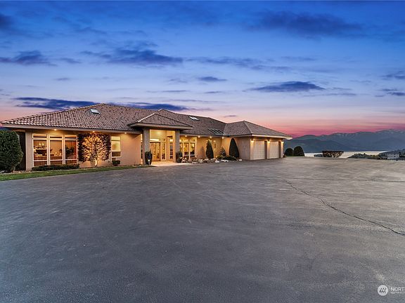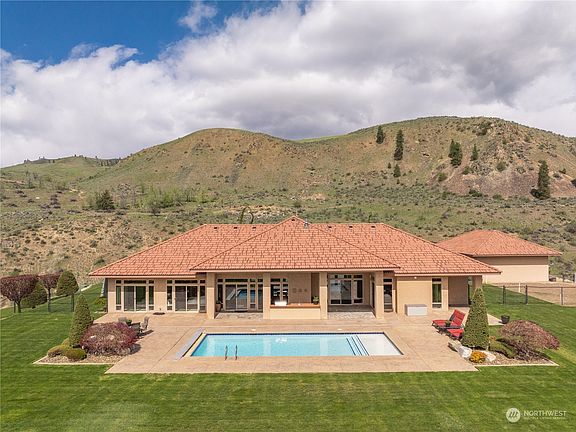 This spacious four bedroom home is nestled above neighboring homes which provides complete privacy. Large windows throughout allow ample light to fill the rooms & offers stunning views of Lake Chelan from every angle. The interior is elegantly designed w/high end finishes, creating a comfortable & luxurious living space. With unobstructed sweeping views of Lake Chelan from Chelan to Manson, take in breathtaking sunsets from your sprawling backyard which features an in-ground swimming pool, fully fenced yard, covered patio & built in cooking area for entertaining. Garden space to grow, 5 garage spaces w/RV parking & ample space for toys. This idyllic retreat offers the perfect blend of luxury, comfort & natural beauty.