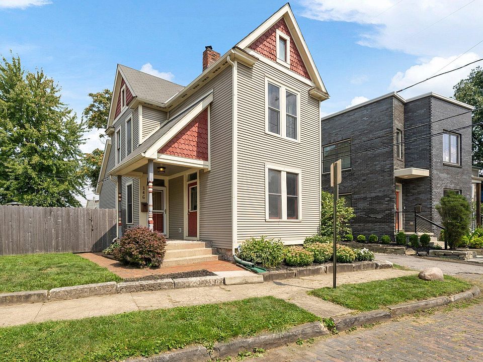 Renovated 2 bed/2 bath home with off-street parking! This Italian Village beauty greets you with a newly remodeled kitchen ('22) with custom Amish cabinetry, quartz counters, gas cooktop, bar seating and separate drink station. Adjacent great room features built-in bookcase, exposed brick, elegant crown molding and large windows allowing for ample natural light. Mudroom with first-floor laundry (washer/dryer to convey) and full bath with clawfoot tub complete the main level. Upstairs has 2 large bedrooms with vaulted ceilings. Updated ensuite bath ('19) features shower with marble tile. Unwind on the fenced-in paver patio that is perfect for entertaining. 2 off-street parking spaces. Surrounded by trendy bars/restaurants with easy access to freeways, Short North, OSU and Downtown. See a2a