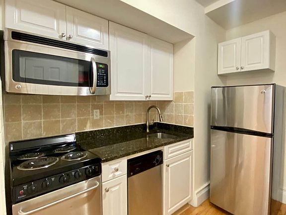 Updated kitchen with stainless steel appliances including a dishwasher, a built-in microwave and granite counter-tops.