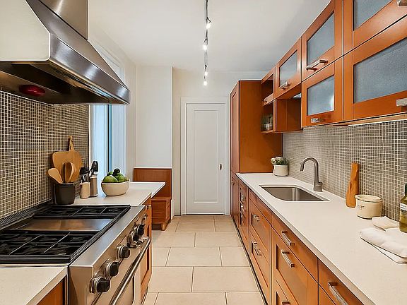 The south-facing living room features a decorative fireplace, offering warmth and character. The chef’s kitchen is equipped with top-of-the-line appliances, including Sub-Zero refrigeration, a DCS gas range and oven with vented hood, a Miele dishwasher, Silestone countertops, a custom backsplash, and a built-in banquette for casual dining.