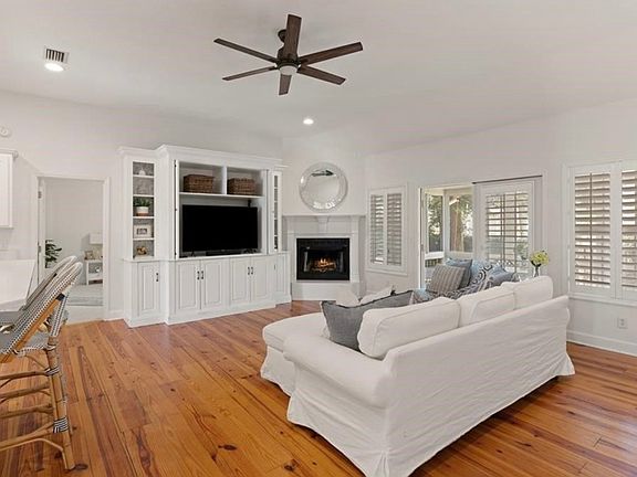 Enjoy relaxing evenings in the spacious living room featuring a wood-burning fireplace, custom built-ins, and french doors that lead to the sun drenched seasonal sunroom with sliding windows and views of the beautifully landscaped backyard including lime trees, a cozy fire pit area, and ample space to entertain- this is indoor / outdoor living at its finest.