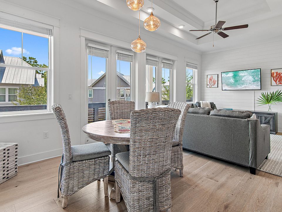 Prominently positioned in the resort-style community of Prominence on 30A, ''Shell Yeah'' seamlessly blends luxury accommodations with inviting coastal charm. Upstairs, the heart of the home welcomes you into a sophisticated living space thoughtfully designed for both relaxation and entertainment. Abundant natural light and warm wood tones create a serene coastal ambiance. A true rarity, this unit also overlooks lush greenery through the balcony spanning the entire width of the townhome (versus a view that looks straight into another unit). The gourmet kitchen showcases stunning Crystal Ice quartz countertops, a premium stainless-steel appliance package with a gas cooktop, and an extended island with integrated seating. The spacious primary suite, bathed in natural light, features a custom tray ceiling and picturesque views of the lush green space. Its spa-like ensuite boasts a double vanity, a walk-in closet, and a beautifully tiled walk-in wet room.