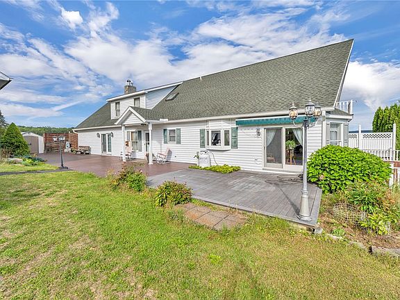 BEAUTIFUL VIEWS, PEACE & QUIET with lots of room to spread out. This 4 Bedroom 4 Bathroom home sits majestically overlooking corn fields and the foothills of the Catskill Mountains. Two large first floor bedrooms. Primary suite with large bathroom with makeup area, closet, full-sized tub. First floor laundry! Up a central staircase you'll find two more large bedrooms, one that is another suite with sitting room and full bathroom and balcony for morning coffee. The largest room has the hook ups to turn into an in-law suite with its own entrance or beautiful balcony. The basement boasts a full kitchen and bathroom with HOT TUB, and a walk out patio. This publicly maintained road only has this house- NO TRAFFIC and someone else plows. Park your large RV in the large car port specifically made for the largest of RV's. Two garage spaces with lots of storage for toys. Small cabin located on the premises for guests. There are so many attributes to this home, you have to make an appointment to take in them all.
