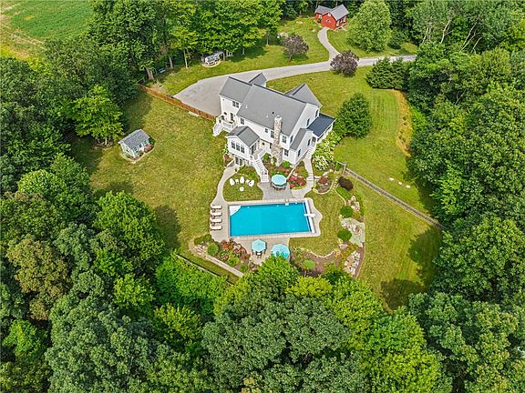 Welcome to your dream home, a beautifully custom designed oasis nestled on a sprawling 16.55 acres. This stunning property features an expansive front porch, perfect for enjoying serene views and capturing the essence of country living. Inside you will find the finest quality appointments throughout, including a gourmet kitchen with exquisite custom cabinetry and luxurious marble countertops sourced from Vermont. The wide plank hardwood floors flow seamlessly throughout the home, leading you to a bright breakfast/sunroom that invites natural light. The family room, complete with cozy gas fireplace, provides an inviting space for relaxation and gatherings. With 4 spacious bedrooms and 3.5 well appointed baths, this home is designed for comfort and elegance. Step outside to discover your personal paradise with a below ground pool with charming pool shed, as well as enclosed gardens and an additional garden shed for all of your gardening needs. Luxury meets the beauty of nature.