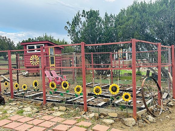 Chicken coop with chickensFenced gardensRain water collectionFruit trees