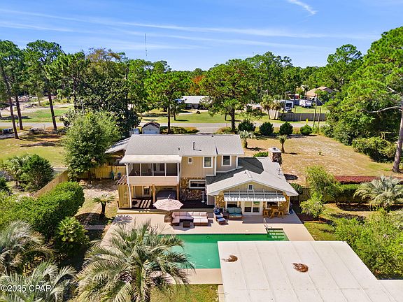 Rare Acreage 4 BR|3.5 BA Home with Pool, Guest Suite & Horse-Friendly Zoning in Panama City Beach! Enjoy the best of coastal country living on over an acre just minutes from the beach. This spacious 4-bedroom, 3.5 bath multi-level home offers a flexible layout and inviting outdoor spaces ideal for entertaining or relaxing. The main house is 2,500 sq ft and features Smart Home technology with video surveillance security system, smart lighting, door locks, and thermostats. The kitchen overlooks the pool and features granite countertops, tongue-and-groove wood ceiling, and a gas stove, opening up to a warm living room with a wood-burning fireplace. The main level includes two bedrooms and 1.5 baths, while the upper level features an office, a bonus reading/gaming room, and a private master suite with a sitting area, double closets, screened balcony, and ensuite bath with double vanities and a large walk-in shower. Step outside to your backyard retreat complete with an inground 60' pool, covered patio with hot tub and grilling area, pool house/mother-in-law suite with covered additional storage area behind it, and pole barn with 110 amp outlet. The pool house/apartment offers 560 square feet of heated/cooled space with a full bathroom and on-demand water heater. Ideal for creating an income producing rental, at-home office, or creating your newest hobby shop. Additional highlights include a two-car garage with storage room and large safe (included), plus a two-car carport. Located just 5 minutes from the Navy Base and 10 minutes from local restaurants, grocery stores, and beach accesses, this unique property offers the space, freedom, and lifestyle you've been looking for. This is the perfect home for those looking to spread out and enjoy the coastal comfort and country living. *All information and measurements approximate, please verify if important.