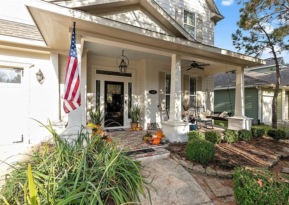 Seize your opportunity to make highly sought-after \"Cottage Green\" your home in this stunning custom-built 2-story, backing up to views of some of The Woodland\'s iconic greenbelts! Known as the \"Front-Porch Series,\" this inviting floor-plan features tasteful aesthetic touches throughout: wood flooring, custom crown molding, elegant lighting fixtures, high ceilings, and beautiful oversized windows ushering in natural light & views of your private backyard haven. Plenty of opportunities to entertain, relax, & play with the open-concept designer kitchen, large front patio with a porch swing, & the sparkling pool & spa. Each bedroom conveniently providing access to it\'s own en-suite full-bath and one bedroom featuring a cozy loft area perfect for a work and/or homework space! Enjoy The Woodlands-area trails, parks, luxury dining, retail, & award-winning schools. Smile...you\'re home.