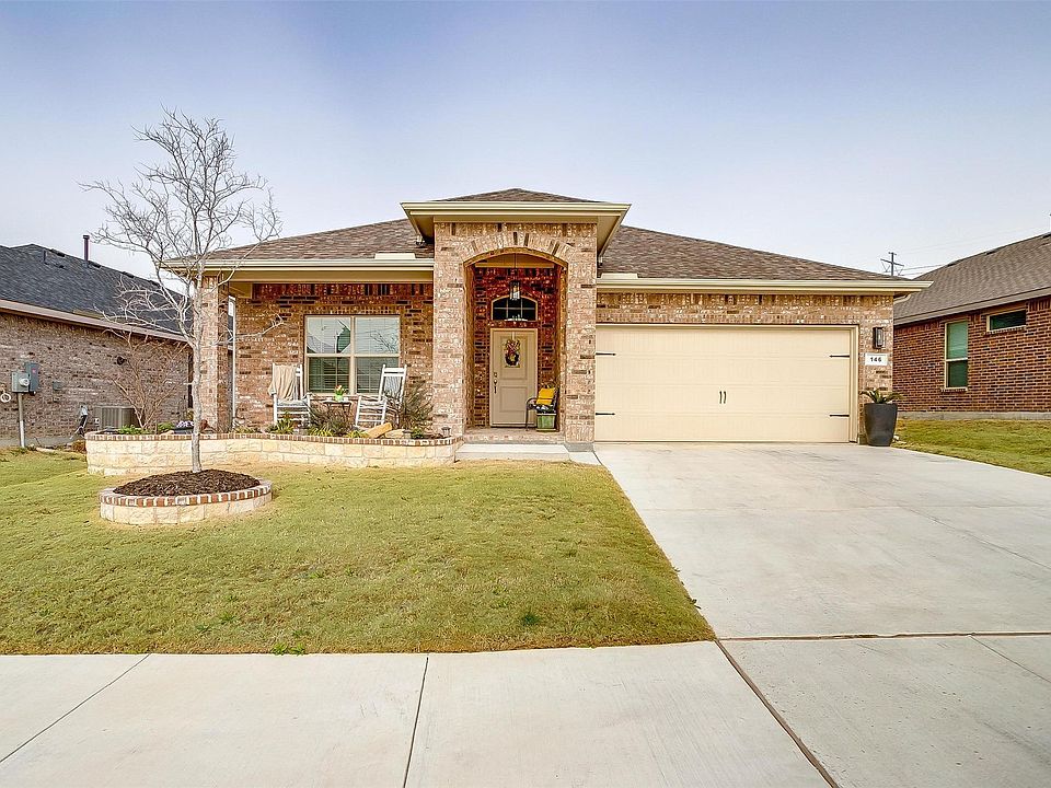 This home is anything but ordinary! Take advantage of the homeowner's dedication and hard work with a space that's full of character and charm. The inviting front porch is the perfect spot for rocking chairs, offering a relaxing atmosphere. As you enter, you're greeted by a grand foyer that leads into the front bedroom. Down the hall, you'll find two additional bedrooms. The open-concept design between the kitchen and living room creates a welcoming space for guests to gather and enjoy each other's company. The gas stove and oven are ideal for cooking enthusiasts and entertainers alike. The primary bedroom is flooded with natural light, and the en-suite bathroom boasts a spacious walk-in shower with a bench, as well as a generous walk-in closet. This community offers fantastic amenities, including a pool, walking trail, dog park, fishing pond, and picnic area. Plus, every Tuesday night, food trucks come straight to you—no need to worry about dinner! Centrally located, this neighborhood is just an hour from Winstar, 40 minutes from DFW Airport, and 20 minutes from the Texas Motor Speedway. Call agent to book your showing today! **4.99% ASSUMABLE LOAN AVAILABLE - CURRENT LOAN AMT $342,367**