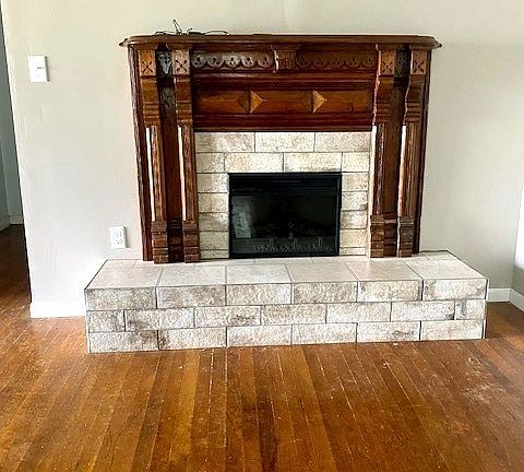 with a fireplace, and the dining room also have hardwood flooring. The kitchen has lovely oak cabinets with lots of cupboards & counterspace. The basement