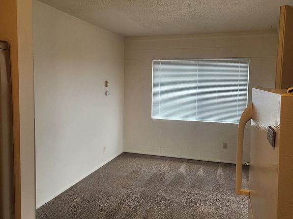 Inside, you'll find freshly shampooed carpet in the living room, hallway, and bedroom, along with durable vinyl flooring in the kitchen and bathroom. The kitchen includes a refrigerator and an electric stove and oven. The home is heated by a gas furnace, and tenants may install a window A/C unit during the summer if desired.