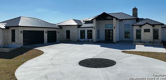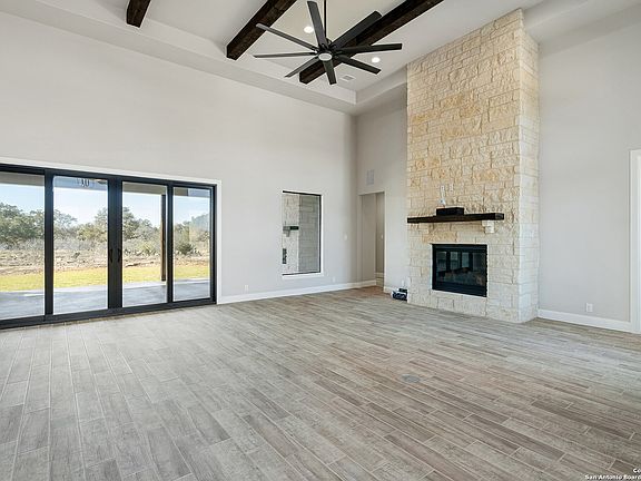 Beautiful one-story home, construction completed Feb 2023, never lived in. Located in a vibrant and active community on the shores of the Guadalupe River and close to Canyon Lake, water sports and activities are abundant. A gated community, The Peninsula at Mystic Shores, with its own POA, and Mystic Shores, also with a POA, provide an amazing list of amenities and plenty of activities. Residents of The Peninsula pay dues to both POAs. The gorgeous exterior is stone and stucco with a metal roof. The lot is 1.47 acre, and sod has been placed around the home, while the rest of the lot has been left in its natural state. Interior features include an open concept floorplan, with the living area flowing effortlessly into the kitchen and dining area, perfect for entertaining. Flooring is luxury wood-look tile throughout. Other features include recessed lighting throughout, quartz counters, high ceilings with stained wood beams in the living area, and a floor to ceiling stone fireplace with remote control. Appliances are propane and electric. The large breakfast bar w/stone surround, is perfect for that quick bowl of cereal in the morning, serving a buffet family dinner, or holding an array of hors d'oeuvres while entertaining your guests. Completing the kitchen are stainless steel Kitchen Aid appliances, a pot filler, and a window pass through to the outdoor living area. The patio, perfect for entertaining friends or great family time, features stained concrete floors, a floor to ceiling stone fireplace w/remote control, stone-enclosed outdoor kitchen, shiplap ceiling, ceiling fan, and a surround-sound system. The home also features dual a/c, 3-car garage, circular driveway, 5 bedrooms and 3.5 baths. Two bedrooms and the spacious laundry room are on one side of the home, and the other side features 3 bedrooms and a powder room. One bedroom has a shiplap ceiling and would make a great study. There are 3 ensuite baths (one is a Jack and Jill) and a powder room. The easy living and fabulous entertaining features, plus the incredible location and available amenities, make this home an outstanding investment and would make anyone proud to call 146 Obscure Way HOME.