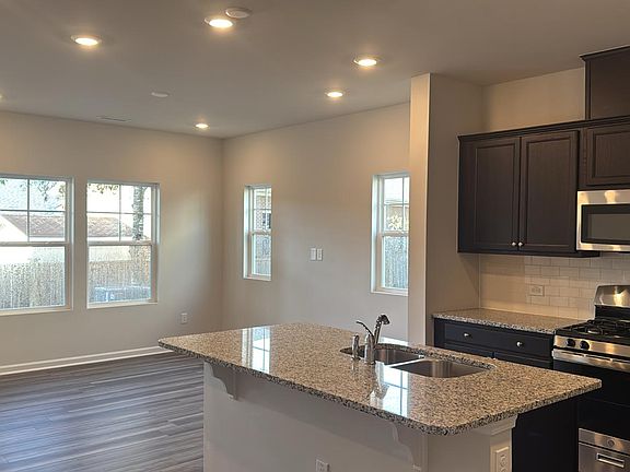 Step inside to a bright open-concept main floor featuring a spacious great room, dining area, and a chef's kitchen with a large island, granite countertops, stainless steel appliances, and a pantry for extra storage. Luxury vinyl plank flooring, 9-foot ceilings, and open stair rails add a touch of elegance.