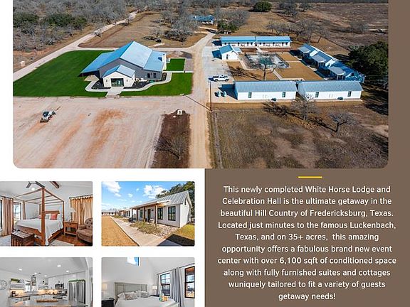WHITE HORSE LODGE – The newly completed White Horse Lodge and Celebration Hall is the ultimate getaway in the beautiful Hill Country of Fredericksburg, Texas. Located just minutes to the famous Luckenbach, Texas, this amazing opportunity offers a fabulous brand new event center with over 6,100 sqft of conditioned space complete with a catering kitchen and walk-in cooler. The tactfully designed Celebration Hall includes towering ceilings with roll-up doors on both sides, allowing for tons of natural light and provides a natural breezeway, along with two large covered outdoor entertaining areas into the main hall. All of these features makes for the perfect venue for large weddings, small family reunions, company parties, you name it! Folks will love the outdoor bar area and fireplace, along with very nice his and her bathrooms equipped with several stalls in each. Plus, there is an unfinished space upstairs set up as the control center for the hall and is plumbed for a full bath, which would make for a great office space or even small living quarters for staff. No matter the occasion, your guests will feel like royalty in this first-class Celebration Hall. THE LODGING – White Horse Lodge currently offers 14 bedrooms with private baths, fully furnished and ready to start renting. With an additional 4 bedrooms possible with a little work. “The Suites” consist of 4 buildings each with two (2) 1 bedroom/1 bath rentals complete with a small kitchenette and luxury bath accommodations that include slipper tubs, walk in showers, polished concrete floors and high vaulted ceilings. The Suites boast a great design with one rental unit on each end of the building, as well as, a well thought out storage room/laundry area between the two rooms, making for plenty of storage and a maid service area. The storage/laundry area has the added benefit of separate common walls from the suites, making for a quiet and serene stay for your guests. “The Cottages” consists of 3 separate buildings which are ideal for guests looking to stay for more than just a night. All of the cottages boast full kitchens with a large living room that includes high vaulted ceilings, exposed beams and high quality finishes along with generously sized master bedrooms and full baths. The Cottages are full-size complete 1 bedroom/1 bath homes. Both the Suites and the Cottages surround and create a unique courtyard around a stunning pool area. The set up really is perfect for both individual guests or large groups who want to gather in one place. “The Office” shares very similar construction as the Cottages. The Office is situated on the courtyard near the pool and across from the Celebration Hall and offers outdoor restrooms for pool guests and would be a perfect location for guest check-in with the option of converting to a 4th cottage with its own private bath and living area inside. This could also be an ideal spot for staff living quarters. “The Farm House” offers 3 additional bedrooms and bathrooms, built in 1995, it has gone through thorough updates and now offers guests a wonderful rental home with wood floors, open kitchen living area complete with a masonry fireplace. The Farm House is nestled a little ways behind the event center with surrounding mature trees creating a secluded back porch and yard making for returning customers year after year. Wait, there is more! “The Back House” is a brand new, but not complete, construction located well away from the Celebration Hall. It will feature a more modern design and includes, 3 more bedrooms with 3 private baths. Interior plumbing and electric is in place, along with many of the mechanical components to complete the construction. The Back House would make a perfect spot to call home for the new owner. It is located across the creek and well away from the other structures and offers beautiful views from the back porch.The White Horse Lodge includes 35.8 acres and only about a 1/3 of which is currently be utilized.