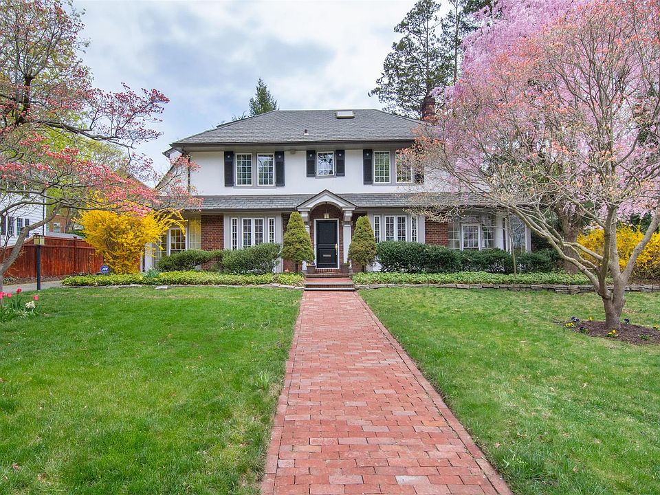 Nestled on one of the most desirable streets in the historic enclave of Cedar Knolls, this stately five-bedroom Colonial offers timeless charm, modern comfort, and exceptional space both inside and out. Gracefully set amid landscaped gardens, the home welcomes you with classic curb appeal and refined architectural details. Inside, a gracious formal living room with a working fireplace sets the tone for elegant entertaining, while the spacious formal dining room is ideal for hosting memorable gatherings, flowing effortlessly into a sunroom/office with floor-to-ceiling windows. The expansive eat-in kitchen offers abundant space and natural light, and abuts a large, private back deck, perfect for morning coffee or afternoon reading. A large home office with three exposures that also has floor-to-ceiling windows, provides a serene work-from-home retreat, and a stylish powder room completes the main level. An open staircase leads you to the second floor, where sunlight pours through an oversized picture window, illuminating the space. This level features three well-appointed bedrooms, including a luxurious primary suite with ensuite bath and a second ensuite bedroom. On the third floor, you'll find a charming bedroom, a full bath, and a flexible bonus room perfect as a nursery, second office, or creative space. The fully finished lower level offers even more versatility—ideal for a recreation room, gym, playroom, or media center, plus ample storage and direct walk-out access to a large deck and peaceful backyard gardens. Rich hardwood floors, detailed moldings, and thoughtful finishes throughout complete this exceptional home. A rare opportunity to own a classic Colonial in one of the area's most sought-after neighborhoods.