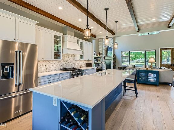 There is a spacious main floor primary bedroom on the back of the home with large corner glass views and a generous bathroom with a large walk in closet. To the front of the home is a nice sized flex area for a den. The great room is superb with a two story vaulted ceiling with full height reclaimed Wyoming snow fence on the fireplace wall. The windows are large with electric power shades. The flooring is European Oak with in floor radiant heat on the main level. This home has a state of the art cold climate heat pump system with air conditioning and heat. There are solar panels on the roof with a storage battery in the 3 car oversized garage. There is also a dog wash in the garage.