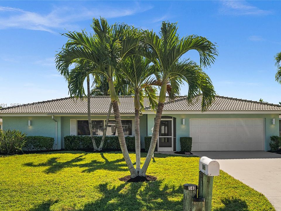 WOW - SPACIOUS INSIDE!! OVER 2500 SQUARE FEET OF RECENTLY REMODELED LIVING SPACE! DIRECT GULF ACCESS! Welcome to this beautifully remodeled Gulf-access home on a quiet cul-de-sac in SW Cape Coral. Enjoy direct sailboat access with no bridges, an 8,000 lb lift, southern exposure, and a heated pool surrounded by tropical landscaping. The open layout features a gorgeous kitchen with a huge island, stainless appliances, soft-close cabinets, and a butler’s pantry. The primary suite has a walk-in closet and updated bath. A guest room opens to the lanai with a sitting room and fireplace, plus an office with its own AC. The bright family room has skylights and sliders to the pool. Updates include impact windows, newer appliances, pool equipment, and more. Close to Tarpon Point and Cape Harbour.