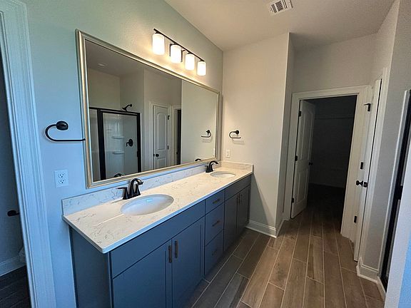 The KLEIN III A in The Settlement at Live Oak community offers a 4 bedroom, 3 full bathroom open design. Upgrades for this home include luxury wood-look ceramic tile flooring, gutters for the front of the home, quartz countertops throughout, a gas fireplace with a quartz profile, and more! Features: double vanity, garden tub, separate shower, and walk-in closet in the primary suite, primary closet goes through to the laundry room for added convenience, tray ceiling in the primary bedroom, double vanity in the second bathroom, a kitchen island overlooking the living room, spacious walk-in pantry, mud room with boot bench, covered front porch, covered rear porch, side-entry garage, recessed lighting, undermount sinks, cabinet hardware throughout, custom framed mirrors in all bathrooms, ceiling fans in the living room and primary bedroom are standard, smart connect wi-fi thermostat, smoke and carbon monoxide detectors, post tension slab, automatic garage doors with 2 remotes, landscaping, architectural 30-year shingles, flood lights, and more! Energy Efficient Features: a tankless gas water heater, a kitchen appliance package with a gas range, low E tilt-in windows, and more!