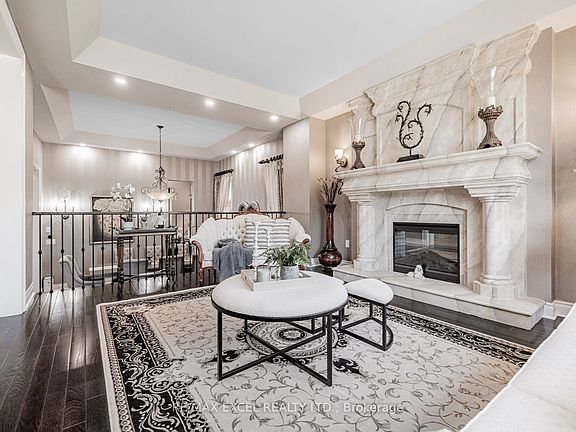 This exceptional 5+2 bedroom, 5 bath executive residence offers over 7,000 sq ft of total living space on a premium ravine lot with a finished walk-out basement. A dramatic 9 ft foyer welcomes you into a formal living room and a soaring 12 ft dining room, seamlessly connected by a butlers servery. The showpiece designer kitchen boasts a 48 gas range, 53 built-in fridge, oversized island, custom cabinetry, and granite countertops, with a sun-filled breakfast area walking out to a spacious deck overlooking the ravine. Flowing 12 ft ceilings continue through the kitchen, breakfast, and family room, highlighted by a stone fireplace and an expansive wall of windows framing serene views. A main floor office, laundry room, and direct 3-car garage access add everyday convenience. Upstairs, a circular hallway with open views below creates an architectural centerpiece, leading to 5 bedrooms with 9 ft ceilings. The primary suite is a true retreat with a sitting area, back-to-back fireplaces, a spa-inspired 6 pc ensuite, generous walk-in closets, and ravine views, while additional bedrooms feature semi-ensuite baths. The finished walk-out basement extends the living space with a theatre and recreation area featuring 9 ft ceilings, along with a childrens play area and a guest/nanny suite. Premium upgrades throughout include hardwood floors, hardwood staircase, pot lights, and designer lighting. With an expansive deck, tranquil ravine setting, and an ideal location close to parks, shopping, transit, and amenities, this home is a rare offering not to be missed.