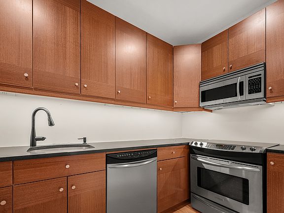 The gourmet kitchen is designed for both function and style, offering stainless steel appliances, generous counter space, and abundant cabinetry. Enjoy contemporary conveniences including central heat and A/C, a video intercom system, and an in-unit washer/dryer.