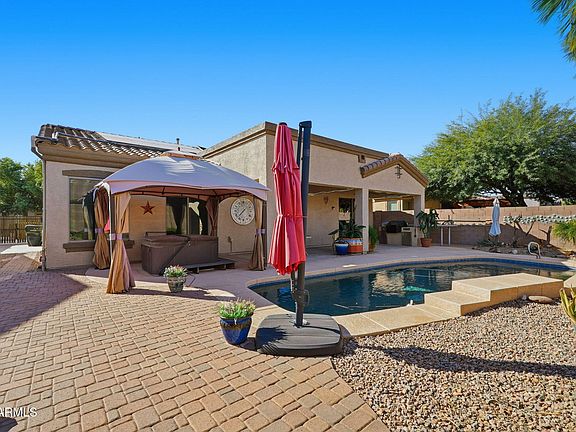 This Arizona backyard will put a smile on your face! Sparkling heated pool, Spa/jacuzzi, built-in Gas BBQ, covered patio with misting system, and resort-style landscaping. You'll be in one of Casa Grande's most attractive neighborhoods - Villago - featuring a lake, fountains, walking/bike trails, lush greenery, and desert beauty. This 4-bedroom home has no carpet, except in the 3 guest bedrooms - any of which could be a perfect office. The split primary suite includes a separate tub and shower, private toilet room, and large walk-in closet. Guest bath has double sinks and a walk-in shower. Upgrades include new kitchen appliances, Nest thermostat, and new flooring in the living and primary bedrooms. Live the Arizona dream at a fair and reasonable price!