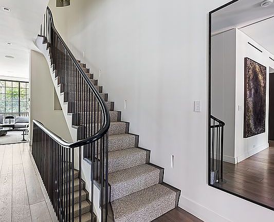 Spanning four levels with three bedrooms, three full baths, three half baths, a dedicated office, and a gym, the layout is designed for both scale and flexibility. A sculptural central staircase and elevator connect all floors, while wide-plank oak flooring in a soft greige tone adds warmth throughout.