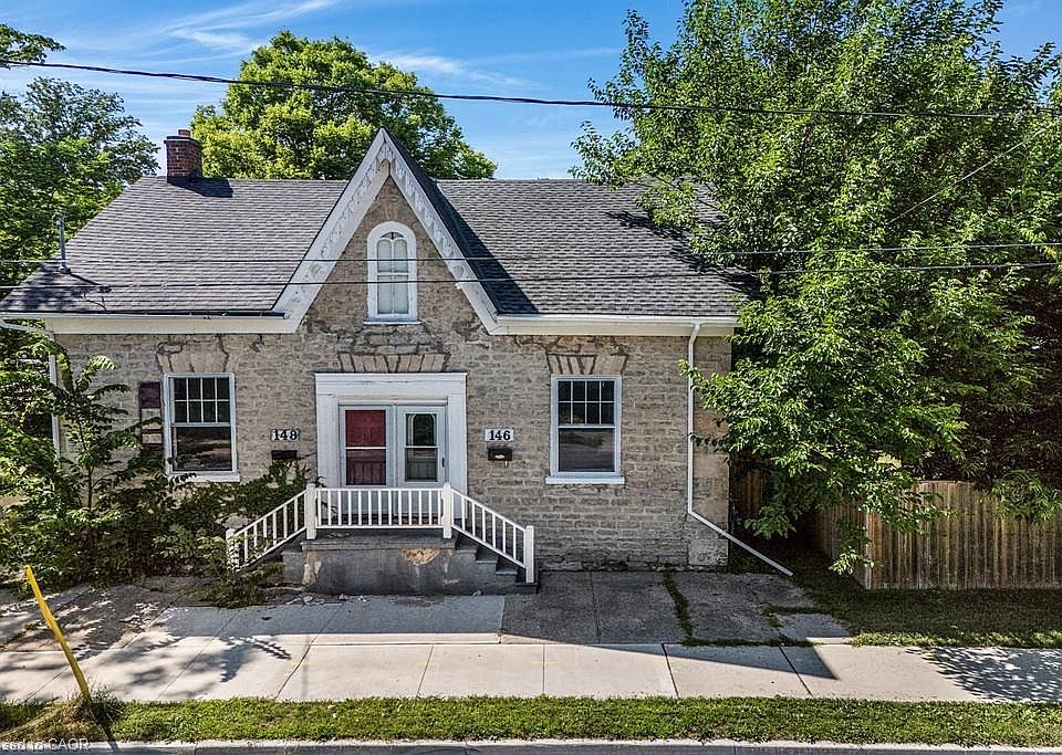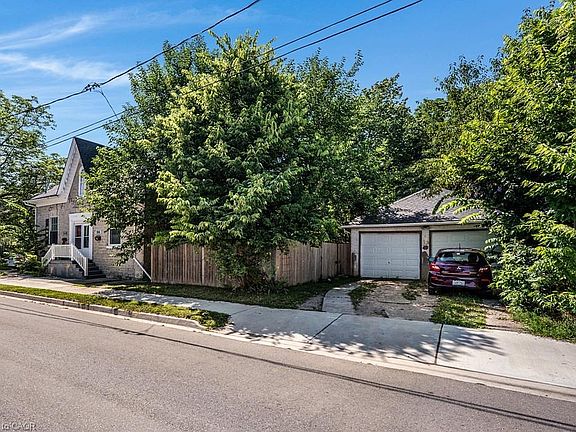 Solid stone semi built in 1895 has loads of character. Spacious interior with high 9 1/2' ceilings in the living room and dining room. Newer kitchen with soft close drawers and cabinets, with walk-out to side porch, backyard and garage. 3 spacious bedrooms and a modern bathroom upstairs. Lots of storage. Lovely, private backyard, surrounded by trees and bushes, provides a terrific sanctuary from a busy life. Double detached garage with hydro is a bonus for cars, workshop or storage. Convenient location a block away from King Street and downtown Preston. If you like unique or one of a kind, this is it.
