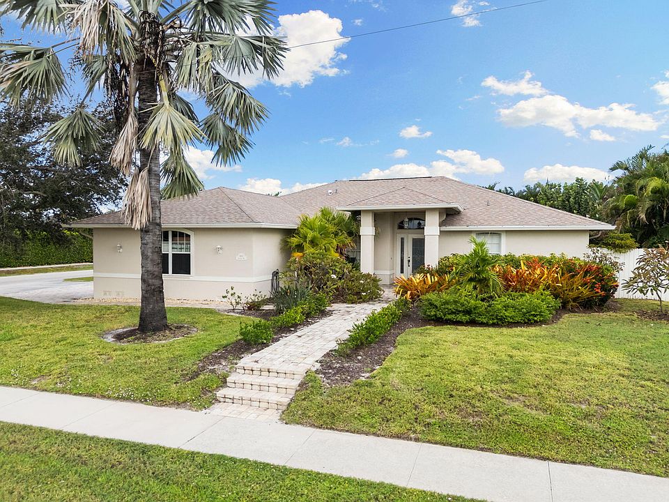 Move right in and start enjoying this beautifully maintained 3-bedroom, 2-bath home featuring a spacious 3-car garage and an inviting pool and spa. Situated on an oversized corner lot surrounded by lush landscaping, this property shows true pride of ownership—everything has been thoughtfully cared for. Enjoy peace of mind with complete storm shutters, a new roof installed in 2022, and plenty of attic storage. The pavered back deck is perfect for relaxing or entertaining.