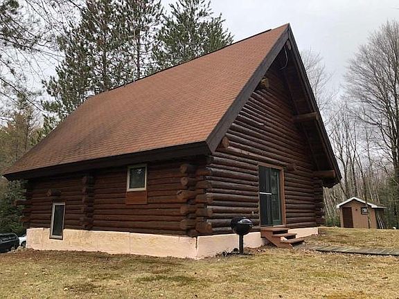 This full log cabin is located on 15 acres of wooded land with 2 permanent tree stands, & ATV trials to play & hunt on. Pelican Lake boat landing is 5 miles south with thousands of Oneida County Forest very close by. The cabin has two bedrooms, a family room with rustic hand built bar, open kitchen dining area and a living room with covered deck and a beautiful view of nature. There is a free standing wood burning stove in the basement & a generator that runs the well, lights, & powers a battery inverter system. There is also a solar panel to maintain the battery power. The stove, refrigerator, & wall heaters are run off LP gas. There is a bath house with LP wall heater, washer, dryer, & full bath with tiled shower. The barn is 20 x 12. There are 2 fenced in gardens, tool shed, & shed to house a new generator. Fresh exterior stain & paint in 2018. Off the grid property.
