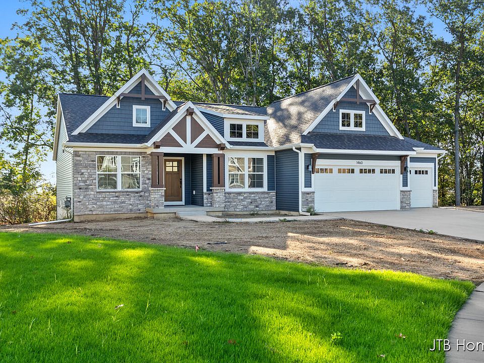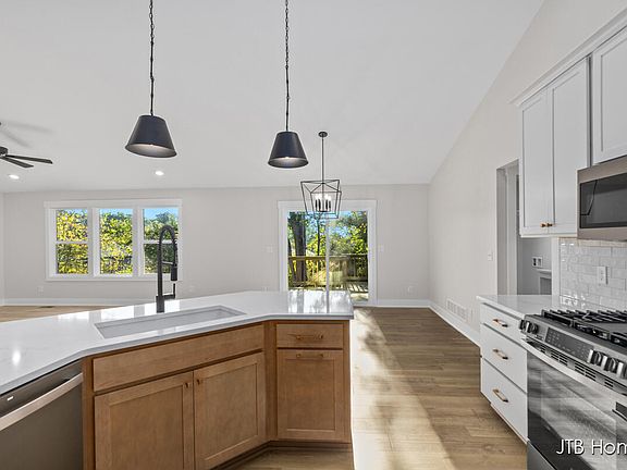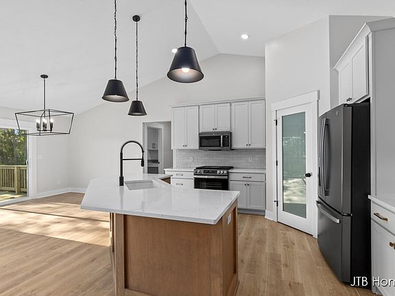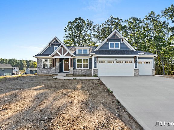 Home eligible for rate lock incentive being offered by seller. Contact listing agent for additional terms & conditions. JTB Homes is proud to present their popular Elmwood ranch floor plan located in Stony Bluff. This home includes a 3 car garage, deck with stairs on daylight lot. There are solid surface counters in the kitchen and full height kitchen backsplash. Home includes LVP flooring throughout kitchen, dining, living room and upgraded carpet/pad in bedrooms. Enjoy the modern electric fireplace in the living room. Other touches include disk lights with dimmers and a GE slate appliance package. The primary suite is complete with ceramic tile shower, walk-in closet and dual vanity in the private bath. Estimated completion August/Sept 2025. Selections have been made and are unable to