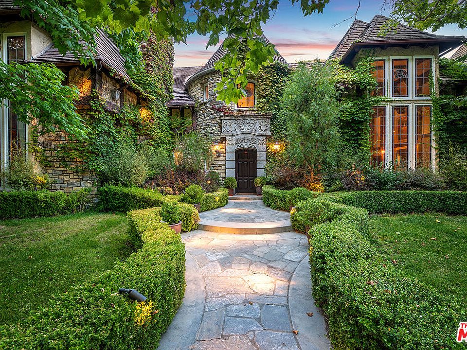 Behind the gates of the exclusive guard gated Moraga Estates in Bel Air, this extraordinary 6-bedroom Traditional "storybook-style" estate blends European charm with California luxury on an approximately 83,328 sf lot, or just under 2 acres. The main house spans over 9,500 sf and is a true showcase of architectural beauty and refined living. Nestled on a sprawling lot with mature vines of Cabernet Sauvignon and Sauvignon Blanc, the property offers a rare combination of elegance, enchantment, and serenity. The main level of the home features a beautiful formal living room with fireplace, a built-in bar, and a magnificent library fit for royalty, fully clad in rich wood paneling with built-ins, coffered ceilings, and a grand fireplace. A spacious family room with fireplace, a grand foyer with a stunning spiral staircase, and a formal dining room adorned with two-story leaded and stained-glass windows fill the home with warmth and light. The expansive gourmet kitchen includes a long eat-in center island, professional-grade appliances, and a sunny breakfast room that opens directly to the central courtyard with a fountain and an outdoor kitchen complete with built-in barbecue and generous island seating. The architectural details evoke timeless romance - arched doorways, steep pitched roofs, and ivy-draped stonework - creating a home that feels both majestic and magical. The exquisitely landscaped grounds are lush with mature trees and greenery that provide both shade and privacy. A full-size tennis court includes a viewing pavilion above, perfect for entertaining. The massive primary suite is a luxurious retreat, offering a fireplace, large private balcony overlooking the pool and gardens, dual custom walk-in closets, and a spa-quality marble bath with steam shower, sauna, separate soaking tub, multiple vanities, and even a barber's chair. Additional features include an attached 3-car garage and approximately 4,500 sq. ft. of bonus space with endless possibilities. The space once housed the world's largest antique slot machine collection and is outfitted with extensive built-in shelving and display cases ideal for showcasing any large collection. It also includes an incredible custom train room, making it a dream for hobbyists or collectors. Whether envisioned as a screening room, game parlor, gym, or creative studio, this one-of-a-kind space offers unmatched potential. The property also offers a pool, spa, koi pond, formal garden, and a custom wine cellar carved into the hillside. Offered fully furnished for a seamless move-in or investment opportunity, this magical estate is tucked away in one of Bel Air's only 24/7 guard-gated communities - just minutes from Brentwood, Beverly Hills, and top-tier schools. A rare opportunity to own a legacy estate that offers scale, serenity, and timeless elegance.