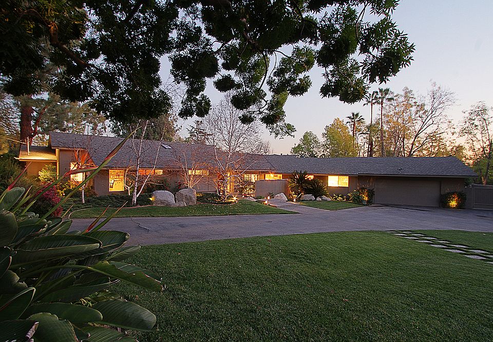 Enjoying abundant natural light, this Mid-Century Modern is in prime condition having been recently expanded and updated. Professional landscape design and a circular drive create an impressive entry. A handsome living room w/ fireplace and a formal dining room w/atrium fountain both overlook the back garden and salt water pool. A gourmet kitchen w/ stainless appliances and granite counters is open to a family room w/custom entertainment center. A bath, pantry, laundry and mud room are adjacent. One bright bedroom w/ bath is located on the south end of the residence while 3 additional bedrooms complete the floor plan to the north. Two of these north bedrooms share a bath and the master suite consists of a walk-in closet and spacious bath. There are several large flat grassy yards, as well as a terrace w/Lynx BBQ. Features include Maple wood and Brazilian tile flooring, Sunbrella remote control exterior shades, dual zone heat/air, Cat5 wiring, Lutron lighting, Panasonic phone system and Wi-Fi zones.