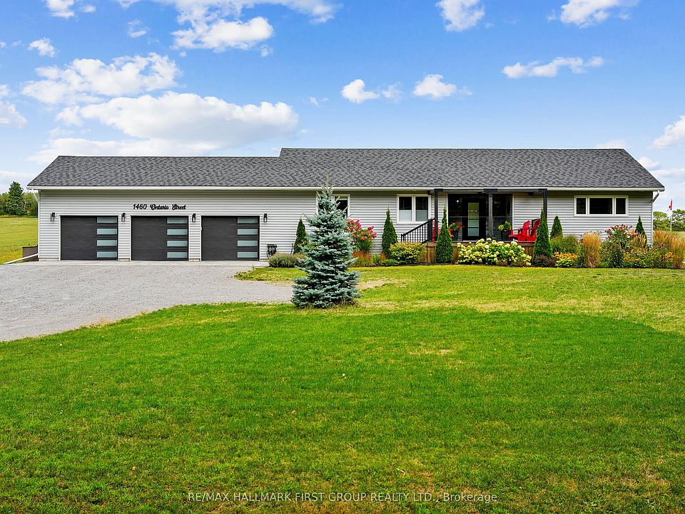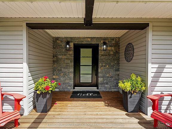 Situated on an acre and overflowing with curb appeal, this stunning property showcases a three-bay garage, an interlocking driveway area, with a charming walkway through perennial gardens to a front porch framed by incredible country views. Inside, a modern open layout begins with a spacious foyer and sun-soaked principal living space. A contemporary fireplace anchors the room, flanked by floor-to-ceiling windows that flood the home with light. Sleek flooring, recessed lighting, and a seamless walkout add to the elevated design. The dining area transitions effortlessly into the thoughtfully designed kitchen, complete with stainless steel appliances, a large island with breakfast bar and pendant lighting, ample cabinetry, and an undermount sink. A walk-in pantry offers exceptional storage, featuring a second sink, drinks fridge, upright freezer, and generous counter and shelving space, keeping small appliances organized yet out of sight. The primary suite is a true retreat, featuring a wood-detailed accent wall, walkout to the hot tub, a walk-in closet with built-ins, and a spa-inspired en-suite with dual vanity, glass shower, and linen closet. The main floor also includes a second bedroom, full bathroom, and a laundry room with storage closet and direct access to the garage. The lower level extends living space with a sprawling rec room highlighted by a fireplace, a media or guest space, two additional bedrooms, and a full bathroom, ideal for family or guests. Outdoors, enjoy a spacious deck with a covered area perfect for lounging or dining, along with a private hot tub space framed by privacy screening. The property's open field views create a serene backdrop, while its location offers both tranquillity and convenience. Just moments to amenities and with easy access to Highway 401, this home is the perfect blend of space, style, and location.