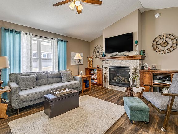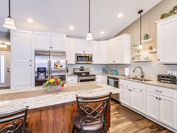 This exceptional 2-bedroom, 2-bathroom, 2-car garage townhome, plus sunroom, offers everything you need for comfortable, modern living—without a single stair inside or out! Thoughtfully designed with high-end finishes, the home boasts stunning granite countertops, under-mount sink, and stainless steel appliances. The kitchen is a chef’s dream with soft-close cupboards and drawers, a large center island/breakfast bar, pantry with pull-out shelving, and a convenient lazy Susan cupboard. Recessed lighting and a vaulted ceiling enhance the spacious, open-concept layout, creating a bright and airy atmosphere throughout.