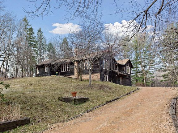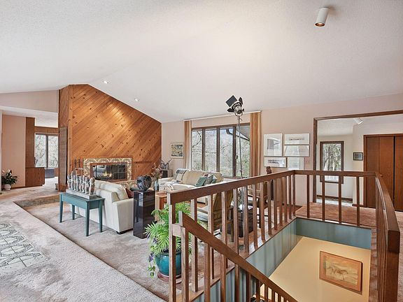 This stunning soft contemporary with vaulted ceilings is nestled on 2 private acres. It is a nature lover's dream within steps of Wolsfeld Woods and plenty of trails and wildlife. The home is nestled in woods, surrounded by fabulous perennials. The home consists of two bedroom "wings" with a large, private deck in between. Many of the mechanicals are newer. See list of updates in supplements. It just needs cosmetic updates to make it the new homeowners' perfect dream home!