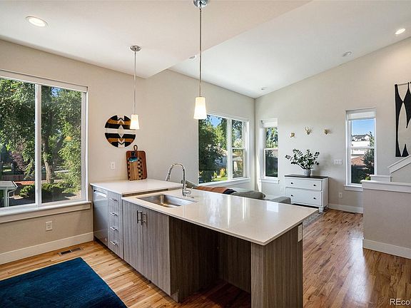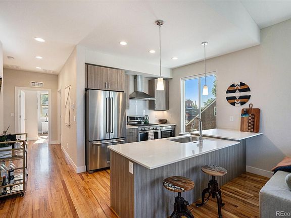Southern end-unit townhome with terrific layout, very private rooftop deck, and ELEVATOR in West Colfax, near Sloan's Lake. With quartz countertops, sleek cabinetry, frameless shower glass, gas cooktop, breakfast bar, custom blinds, hardwood floors throughout, and rooftop deck with panoramic mountain views, this contemporary townhome has it all! The light-filled floorplan features a 2nd level kitchen/dining/living accompanied by a spacious primary bedroom and large bathroom. The ground floor offers a large front patio, attached heated garage, and a spacious foyer that can be used for home office or gym. Located three blocks from the bike path with quick connectivity to the Cherry Creek and South Platte trails. Walkable to the Perry St lightrail station and Sloan's development which provides many new retail options including Sloans Tap & Burger, The Patio at Sloan’s, Little Man Ice Cream, Starbucks, Alamo Drafthouse & Cinema and much more. Unit is ADA compliant and wheelchair accessible.