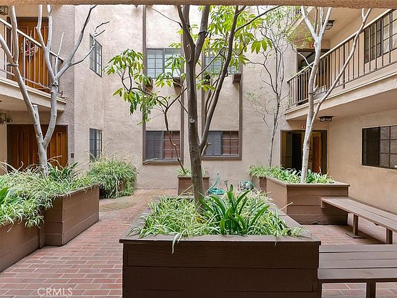 The balcony is surrounded by lush greenery, creating a tranquil spot for morning coffee. Secure gated parking provides 2 tandem spaces, and the building offers 5 guest spots. Amenities include a community room with a full kitchen and bar, a billiard table, gym equipment, and a meeting room. Downstairs, there's a large in-ground spa and sauna. The building is retrofitted and includes earthquake insurance.