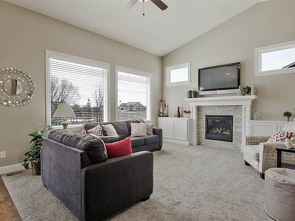 Don't miss this Blue Custom Home with so much natural light. From the moment you walk into the front door the home has a wonderful open foyer that leads to a dream kitchen with vaulted ceilings. If you love to entertain you will fall in love with this kitchen that has a large island and lots of beautiful granite counter tops and large dining area. The kitchen also opens up to the living area that features a gorgeous fireplace with built-ins on each side. The master bedroom has a bay window and a 4 piece master bathroom with double sinks. Home has a covered deck and a second covered patio area off the garage. Still time to pick out the granite downstairs and carpet for a few more weeks. Basement features large family room with bar and plenty of storage, Large bedroom and third bath. The garage is a over sized three car that measures 36 x 31 deep where the built-in work area is. Home has landscaping & irrigation well done for you along with custom blinds.