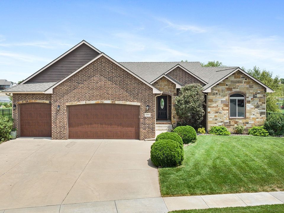 What a View! Stunning 5bed/3bath/3car Ranch on Lake Lot with Tons of UPGRADES in Maize School District! NO SPECIALS! Pride of ownership is evident in this extremely well-maintained home. As you enter, you will be welcomed by an abundance of natural light, soaring ceilings and breathtaking lake view! The open-concept Kitchen/Living Room boasts of wide plank wood floors, custom moldings and cabinetry, extra-large windows and a stone surround fireplace flanked by two custom built-in bookcases. The Kitchen is IMPRESSIVE, boasting of stainless steel appliances, a new gas range with a double oven, granite countertops, gorgeous custom wood cabinetry and a large HIDDEN Walk-In Pantry! The roomy dining area has a beautiful view and direct access to the covered deck. Don’t miss the Drop-Zone and large UPSTAIRS laundry room with sink directly off the kitchen. The Primary Bedroom includes a sitting area with a beautiful lake view, tray ceiling and dual-walk-in closets. The spacious Primary Bathroom has double sinks, granite countertops, custom cabinetry with tons of storage and a HUGE spa-like shower with dual shower heads! There is also convenient access to the Main Floor Laundry from one of the Primary Bedroom Closets. Finishing off the main floor of this split-bedroom floor plan are two additional bedrooms and a full bathroom on the opposite side of the house. Head downstairs to the cozy extra-large family room equipped with surround sound and a gorgeous custom wet-bar and beverage refrigerator. Two large bedrooms with large walk-in closets and full bathroom, a SECOND set of laundry hookups and an unfinished storage room finish off the basement. The exterior space of this home is ideal for entertaining with a large covered deck, lower extended patio with a custom fire pit. Outside you will also find a brand new fence, sprinkler system with an irrigation well and an underground pet fence that extends to the front yard. Large 3-car garage with built-in overhead storage shelves, upgraded Class IV impact resistant roof, CAT 1GHz wired connections throughout. The pond surrounded by a walking path and is stocked with fish. The neighborhood swimming pool is just steps away! Don’t miss this rare find, come see for yourself!