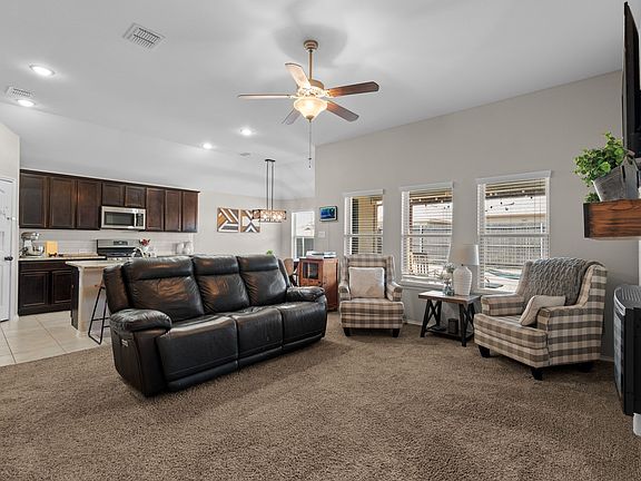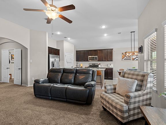 This beautiful 4-bed, 2.5-bath home offers 2,372 sq ft of flexible living space, including two bonus rooms perfect for a home office, playroom, or media room. This home is perfect for growing families, remote work, or entertaining. Enjoy a bright living area with high ceilings, custom shiplap wall, rustic mantel, and electric fireplace. The kitchen features granite countertops, stainless appliances (Bosch dishwasher), and a large island with bar seating.Outside, relax on the extended patio under a pergola with a brand-new metal roof. The fully fenced yard includes a large playset and a charming wooden playhouse. Added bonus: custom Christmas lights stay with the home to make holidays special, as well as added overhead garage storage. The carpet is in great condition, but sellers are offering a $2,000 flooring credit so buyers can personalize the flooring to their taste.