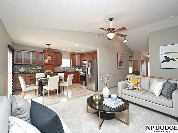 Saddlebrook is one Omaha's favorite neighborhoods. Standing Bear recreation is next door and features a 133 acre lake, ideal for kayaking and fishing, 3 miles of walking trails and picnic areas too. The neighborhood features an elementary school, library and community center. Ever popular and affordable ranch plan now available. 3 bedrooms and 2 baths. Split bedroom plan; large primary suite includes roomy walk in closet. Great room is comfortable and inviting with wall space for large tv. Kitchen design is versatile with options for casual and formal dining. Unfinished basement offers opportunity to add more square footage. Enjoy large patio overlooking private and nicely landscaped backyard. Easy access to the interstate and W Dodge expressway. Don't miss out on this terrific opportunity. Property taxes partially home instead exempt.