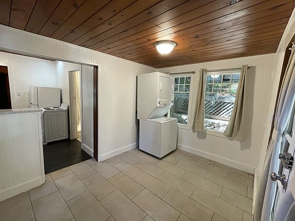 The kitchen includes an electric range, refrigerator, small countertop dishwasher, and stackable washer and dryer. Cozy up to the propane fireplace and enjoy the comfort of electric heating. Additional features include an exterior upper patio area and a wooded yard.