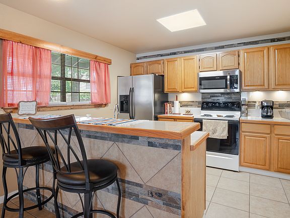 Fully equipped kitchen Stove, oven, refrigerator, microwave, toaster oven, coffee maker, and complete cookware/dining ware.