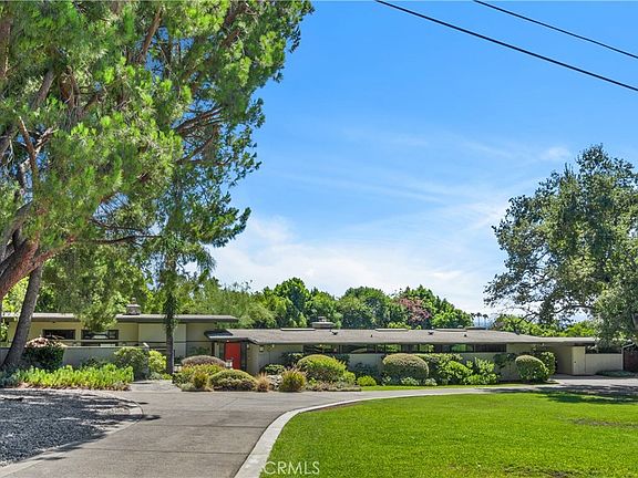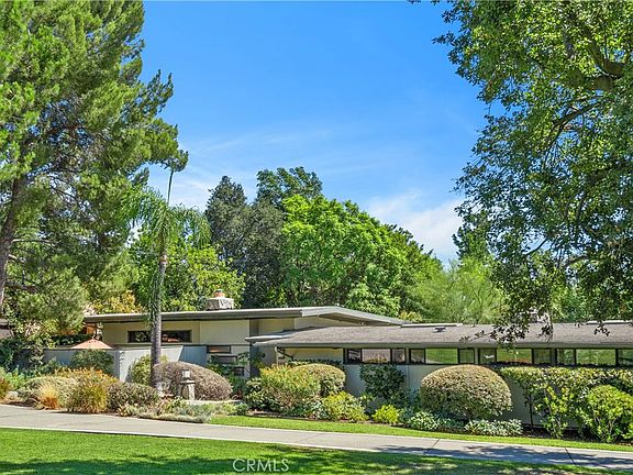 Beautifully landscaped single-story Mid-Century Modern home on over an acre of land! With wonderful mountain and city views, the yard has many fruit trees, including orange, lemon, lime, fig, avocado, apple, and peach. A newer gazebo sits next to the sparkling pool and spa, perfect for outdoor entertaining with outdoor kitchen including BBQ, small refrigerator, lights, and sink. The two-car carport with utility sink, storage cabinets, and EV plug is attached to the house. The house itself has an open floor plan with four bedrooms, including a newer master bedroom suite with wood-beamed ceilings and private patio, a two-sided stone fireplace, and an oversized walk-in closet with a sliding ladder for access to shelves. Master bathroom shares a fireplace with the bedroom and has cherry cabinets with/double granite sinks, a spa tub, and a shower. There are two additional bedrooms in the main house, each with adjacent bathrooms. The fourth guest unit/bedroom with 3/4 bath is on the other side of the carport. The living room and family room have wood-beamed ceilings and share a double-sided stone fireplace. The kitchen has original cabinets with granite counters and a breakfast bar. The property also has a stand-alone office/workshop building and a storage shed.