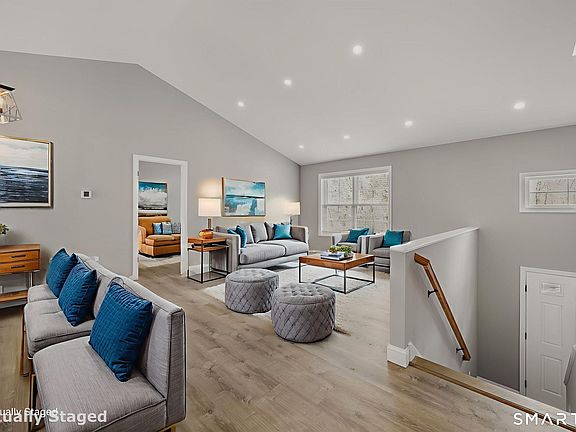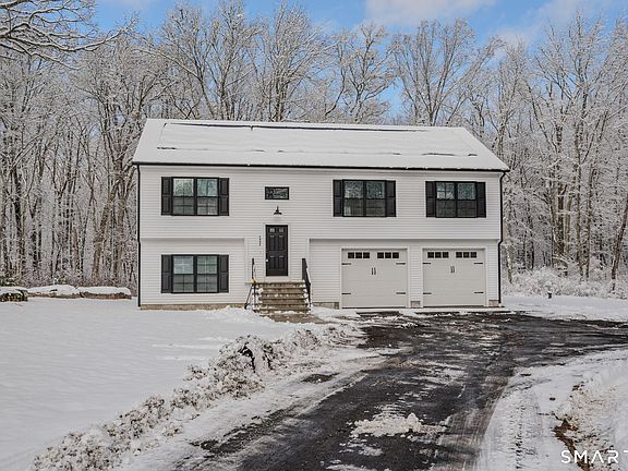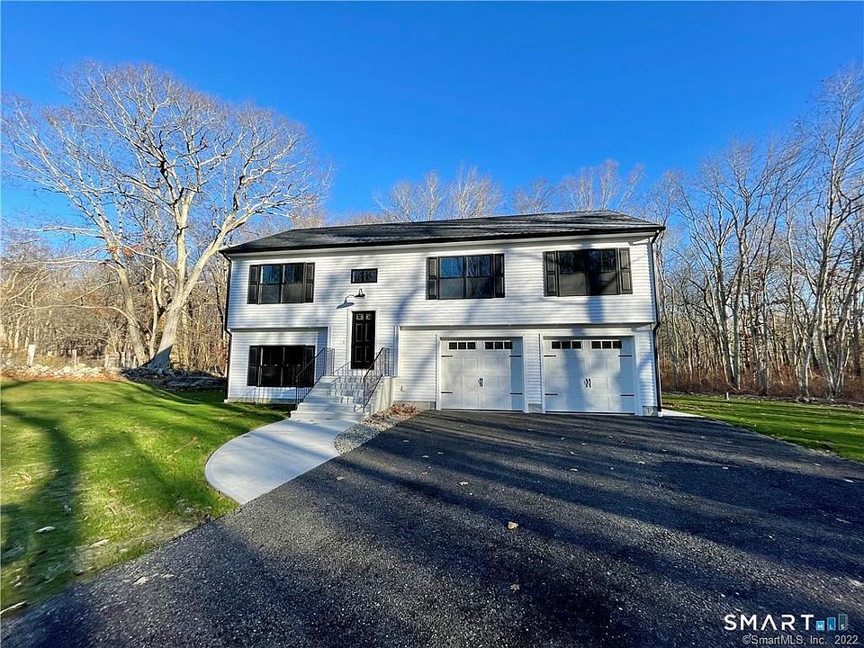 Built in 2022, this beautifully maintained raised ranch sits on a private 5.33-acre parcel in scenic Voluntown, Connecticut. Designed with today's buyer in mind, the home offers an open-concept floor plan accented by vaulted ceilings and abundant natural light. The main level features a spacious primary suite with a large walk-in closet and a private ensuite bath complete with a walk-in shower. Two additional bedrooms and a full three-piece bath are also located on the main floor, along with the convenience of main-level laundry. The finished lower level expands the living space with an additional bedroom, a generous family room, a full bath with a walk-in shower, ample closet storage, and direct access to the oversized two-car garage. Modern curb appeal is highlighted by crisp white siding and striking black-trim windows, while the expansive acreage offers privacy, versatility, and room to enjoy the outdoors. A rare opportunity to own a newer-construction home with space, style, and functionality in a peaceful rural setting.