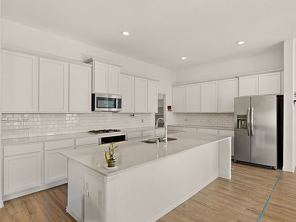 Step inside to discover ceramic tile flooring in the main living areas and plush carpeted bedrooms, complemented by energy-efficient LED lighting throughout. The dream kitchen is a true centerpiece, featuring a large island, granite countertops, stainless steel appliances, cabinetry with modern door handles, and a walk-in pantry ideal for both everyday living and entertaining. The spacious living room is prewired for a flat-screen TV and includes a data line, making it perfect for movie nights or working from home, while the formal dining area sets the stage for memorable gatherings.