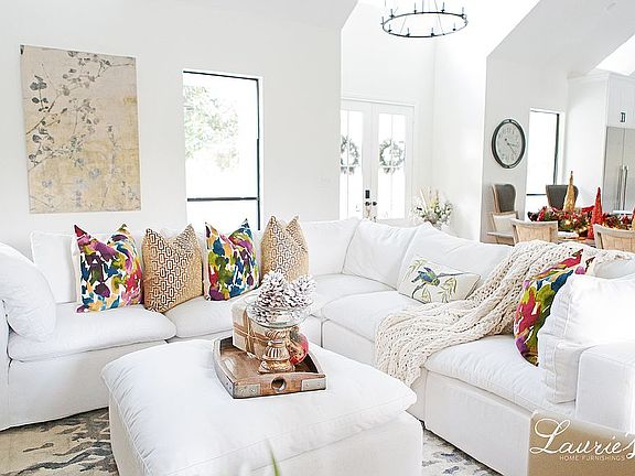 The chef’s kitchen includes a Thermador appliance package, butler’s pantry with ice maker, and wine chillers. Large custom sliding doors open to a resort-style patio and pool area with fireplace and motorized privacy screens.